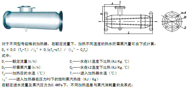 2、外形尺寸 3、产品用途 ●.用于热水采暖系统中,作加热设备代替原板式换热器; ●.用于浴室加热热水,送入水箱,代替热水箱中原高噪声,强振动的蒸汽直接加热方式; ●.用于除氧器预热软水; ●.用于水-水换热。