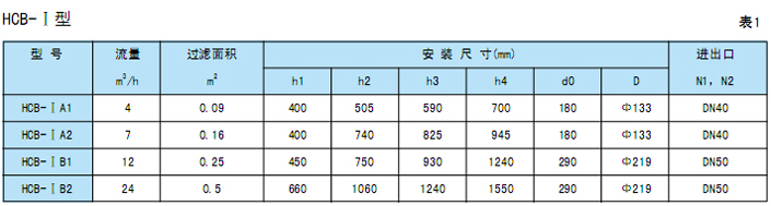 3、HCB-Ⅰ型单袋式精密过滤器设计参数(见图1,表1)