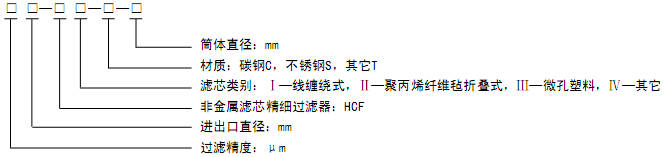 1、产品型号标注 2、HCF-I型线缠绕式精细过滤器 其滤件是由纺织纤维纱精密缠绕在多孔骨架上,控制滤层缠绕密度及滤孔形状而制成不同过滤精度的滤芯,具有优良的深层过滤效果,良好的化学相容性。线缠绕式精细过滤器能有效除去液体中悬浮物、微粒。过滤精度0.5μm~100μm。3、HCF-Ⅱ型聚丙烯纤维毡折叠式精细过滤器 其滤件是由聚丙烯超细纤维毡经折叠而制成的滤芯。聚丙烯纤维毡折叠式精细过滤器具有处理量大、过滤效率高、阻力小、无纤维脱离、可杀菌消毒等特点。过滤精度0.1μm~100μm。