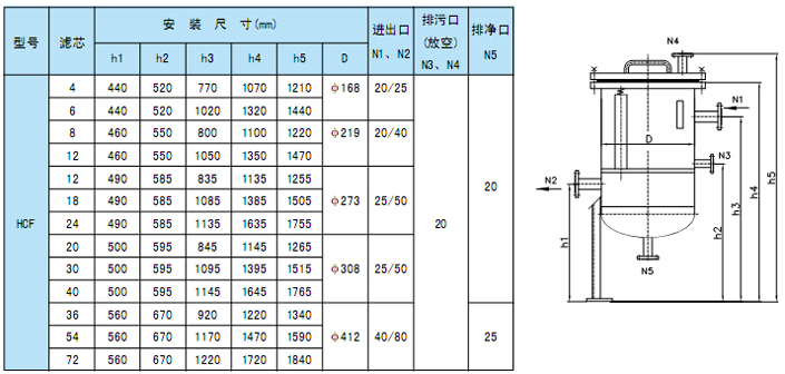 4、HCF-Ⅲ型微孔塑料滤芯精细过滤器 其滤件是由高分子量聚乙烯烧结成型。具有刚性好、重量轻、孔隙率高、可反冲洗再生、无毒、耐蚀。过滤精度0.5μm~100μm。 ●.非金属滤芯精细过滤器结构典型结构及尺寸 注:1.滤芯数指折合标准型滤芯(10”长)数目。 2.本图适用于DN≤500,由于工艺参数各不相同,因此,在订货时,我公司将按实际的工艺参数作适当修正。 注:1.滤芯数指折合标准型滤芯(10”长)数目。 2.本图适用于DN≥500,由于工艺参数各不相同,因此,在订货时,我公司将按实际的工艺参数作适当修正。