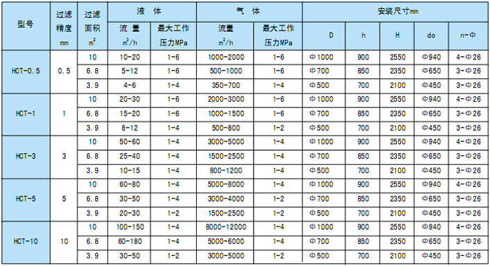2、产品型号标注 3、陶瓷滤芯精细过滤器安装尺寸 注:表中液体流量均指水的流量,气体流量均指标准状况下空气流量。 4、各种滤芯主要技术指标 线缠绕式滤芯 外径.——Φ65mm;内径——Φ29mm;长度——250、500、750、1000mm 耐压——0.5MPa;耐温——60℃(聚丙烯骨架)、120℃(不锈钢骨架、棉滤层)、280℃(不锈钢骨架、玻纤滤层) 过滤精度——0.5、0.8、1、3、5、10、20、30、50、75、100m. 聚丙烯折叠式滤芯 过滤精度(m.):0.1、0.2、0.45、1、2、3、5、10、30、60 耐压(MPa):0.4 最高工作温度(℃):80 最高消毒温度(℃):120、(0.1MPa) 尺寸规格:外径——Φ65mm;内径——Φ30mm;长度——250、500、750、1000mm