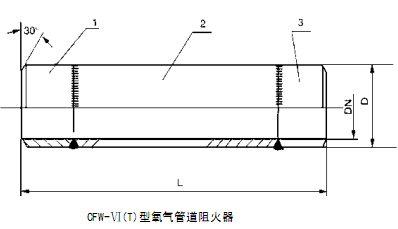 6、CFW-Ⅵ(T)型氧气管道阻火器 氧气管道阻火器和氧气管道阀门后阻火器采用特种铜合金和不锈钢、碳钢焊接而成。它在氧气管道中具有阻火特点,可有效地切断火源,杜绝管道中燃爆事故的发生,在管道输氧过程中,愈来愈显示它的必要性与阻燃的优越性。 注:①.1、3材质为0Cr18Ni9Ti、1Cr18Ni9Ti或20; ②.2材质为T1、T2、TU1、TU2、B10。